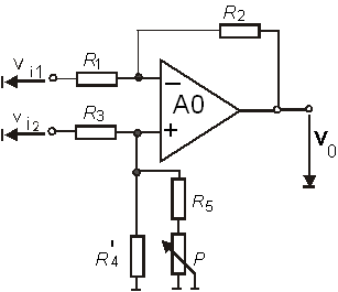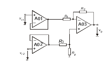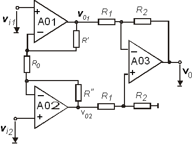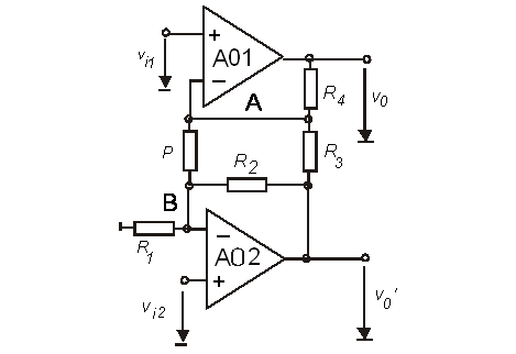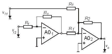 Pentru fiecare din primele doua AO se închide o bucla de reactie negativa. Ca urmare, diferentele de potential între bornele lor de intrare sunt nule astfel încât potentialul punctului A fata de masa este vi1 iar cel al punctului B este vi2