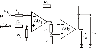 Tensiunea de la iesirea AO1, vo1, se obtine prin superpozitie; tensiunea vi1 este amplificata în schema de amplificator neinversor (la anularea tensiunii de intrarea vi2, punctul B este un punct virtual de masa datorita reactiei negative realizate prin rezistenta R"), iar tensiunea vi2, prin R0, într-o schema de amplificator inversor: