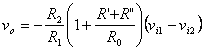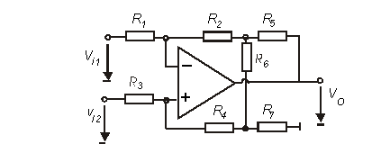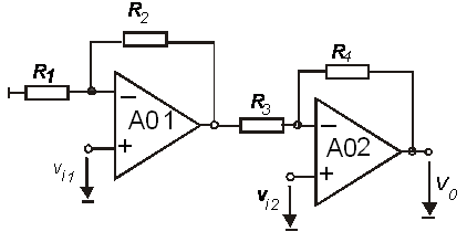 Tensiunea de intrare vi2 se aplica unui inversor de tensiune format cu AO1 si, apoi, se aplica, împreuna cu tensiunea de intrare vi1, unui circuit sumator inversor realizat cu AO2. Se obtine, la iesirea circuitului, tensiunea:
