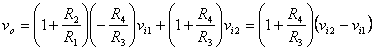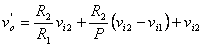 Se observa ca, între cele doua borne de intrare si iesirea celui de al doilea AO, se obtine un amplificator diferential care preia toate performantele amplificatorului diferential din schema de principiu (mai putin elementele relative la marimile reziduale pentru ca intervin si parametrii celui de al doilea AO). Ca urmare, tensiunea la iesirea sa va fi: