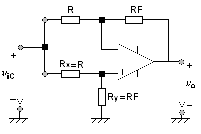. se determina curentii prin rezistentele circuitului: mai intai se noteaza cu i1 curentul prin R si cu i2 curentul prin RX; apoi, se tine cont de faptul ca i si i sunt egali cu zero, fiind curenti de intrare in AO; rezulta pe baza TK1 aplicate in nodul la care este conectata intrarea inversoare, respectiv neinversoare a AO-ului ca prin RF curentul este tot i1, respectiv prin RY curentul este tot i2: