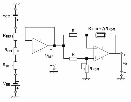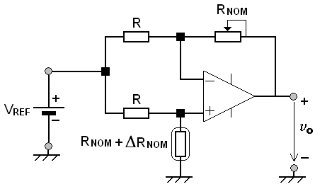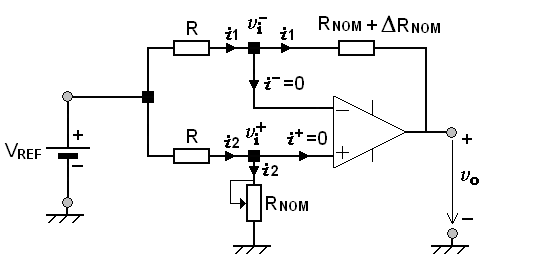 de unde rezulta ca acest circuit masoara, prin intermediul variatiei DRNOM, variatia marimii fizice monitorizate. In cazul in care rezistenta traductorului se afla exact la valoarea nominala RNOM, se spune ca sistemul de masura = amplificatorul se afla intr-o stare de echilibru. In acest caz, DRNOM este zero, iar tensiunea de iesire vo a amplificatorului are valoarea zero. Amplificatorul sesizeaza si masoara iesirea sistemului de masura din aceasta stare de echilibru, deoarece numai in acest caz DRNOM este diferita de zero.