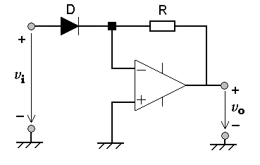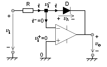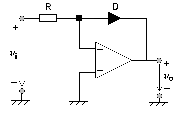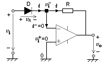 . Se stabileste curentul prin dioda D. Mai intai se noteaza cu i curentul prin rezistenta R. Aplicand TK1 in nodul la care este conectata intrarea inversoare, tinand cont de faptul ca valoarea curentului i prin intrarea inversoare este zero, rezulta ca prin D curentul este tot i.