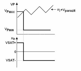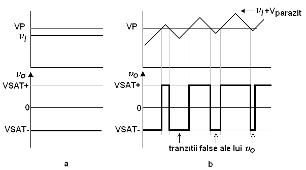 De exemplu, daca vi<VP dar are o valoare foarte apropiata de VP, in mod corect v0=VSAT (vezi Figura 19.a). Dar, datorita semnalului parazit, tensiunea totala care apare pe intrarea neinversoare, care are valoarea vi+Vparazit, poate manifesta o succesiune rapida de depasiri/scaderi fata de valoarea VP, ceea ce genereaza tranzitiile false amintite (vezi Figura 19.b).