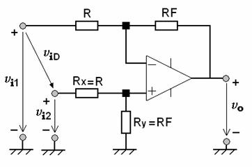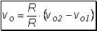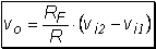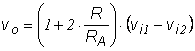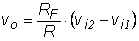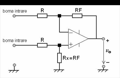 In urma calculelor (tinand cont de faptul ca RX=R si RY=RF, rezulta ca tensiunea de iesire vo se poate calcula in functie de tensiunile de intrare vi1 si vi2, cu relatia de mai jos: