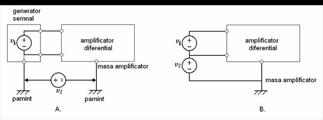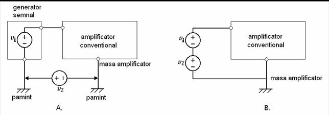 Primul caz este ilustrat in Figura 5.a. La alimentarea amplificatorului, acesta devine conectat prin priza cu impamantare la pamant. La intrarea sa se conecteaza un generator de tensiune care genereaza o tensiune electrica vi - acesta este semnalul util, numai acesta ar trebui amplificat. Ca si amplificatorul, la alimentarea generatorului de tensiune, acesta devine conectat prin priza cu impamantare la pamant. Exista diverse surse care genereaza zgomot, efectul net al acestor surse fiind modelat in Figura 5.a prin intermediul unei surse de zgomot notate vZ - acesta, fiind un semnal parazit, care nu codeaza nici o informatie, nu trebuie amplificat.