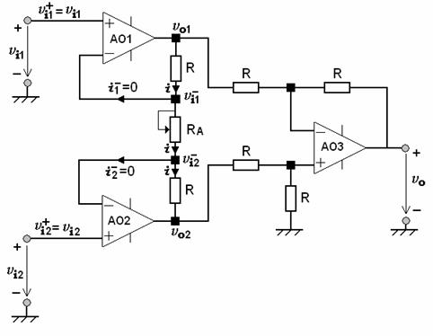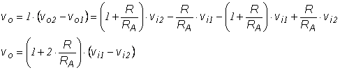 . se aplica legea lui Ohm pe rezistentele R conectate intre iesirea si intrarea inversoare a amplificatoarelor AO1 si AO2 si pe RA si se tine cont de rezultatele de la punctele 1 si 2: