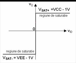 AO-ul are o amplificare in tensiune (definita ca raportul vo viD) foarte mare, de ordinul sutelor de mii, unde viD reprezinta diferenta tensiunilor aplicate pe cele doua intrari, iar vo este tensiunea de iesire. Deoarece amplificarea in tensiune este foarte mare, de indata ce tensiunea viD este diferita de 0, iesirea se stabileste, in functie de semnul tensiunii viD, la o valoare constanta, numita tensiune de saturatie pozitiva, respectiv negativa, asa cum este sugerat si in Figura 17, care reprezinta caracteristica de transfer (de functionare) a AO-ului, unde VCC si VEE reprezinta tensiunea de alimentare pozitiva, respectiv negativa a AO-ului.