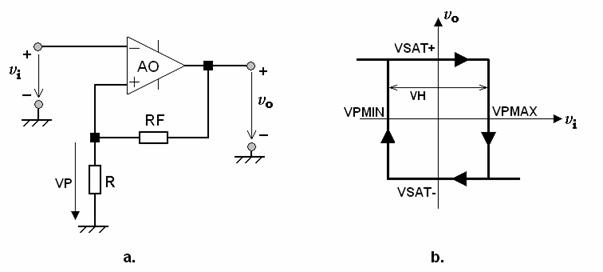 Rezumand cele discutate mai sus, caracteristica de transfer a comparatorului cu histerezis este cea prezentata in Figura 20.b, in care diferenta dintre VPMAX si VPMIN se numeste tensiune de histerezis si se noteaza VH.