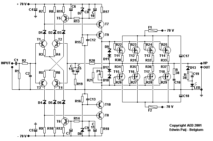 Les sources de courant de +/- 1 mA sont réalisées autour de T5 et T6. Les diodes D1 à D6 permettent l'utilisation de transistors à faible bruit de type BC550C et BC560C, les transistors T7 à T10 forment l'étage driver. Le potentiomètre P1 permet le réglage du courant de repos à 100 mA par transistor de sortie.