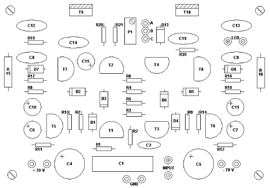 Constant current sources of +/- 1 mA are carried out around T5 and T6. The diodes D1 to D6 allow the use of low noise transistors type BC550C and BC560C, the transistors T7 to T10 form the stage driver. The potentiometer P1 allows the adjustment of the quiescient current to 100 mA per output transistor.