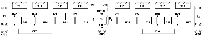 Transistors T9 and T10 must be assembled on a common heatsink with 5° c/w thermal resistance or on the output stage heatsink.