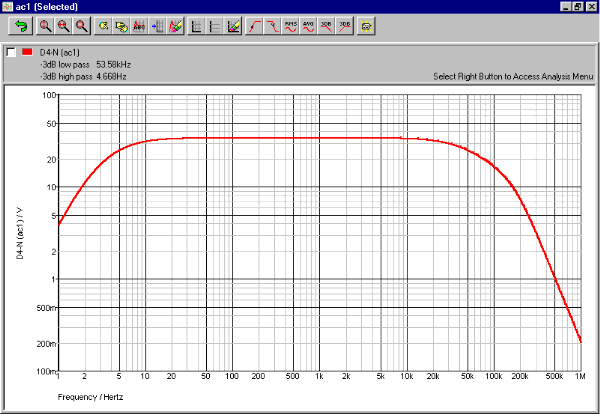 La bande passante est limitée de 5 Hz à 53 Khz (à - 3 db) par le module d'entrée (C1, R1, C2, R2). Celle-ci peut être modifiée en fonction de l'application souhaitée. Il est inutile d'augmenter la bande passante vers le bas (graves) car peu de signal utile est présent dans le bas du spectre. En sono la bande passante est souvent limitée entre 20 et 35 Hz. Les HP sont ainsi protégés contre des signaux trop importants aux fréquences extrêmes-graves et plus de puissance est alors disponible pour le restant du spectre.