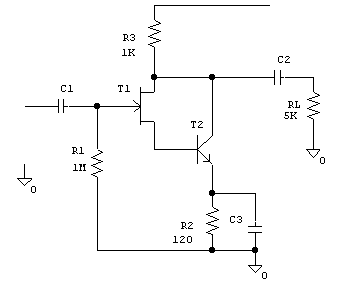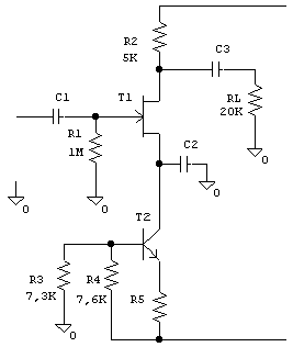 Pentru circuitul din figura sa se calculeze Au, Ri, Ro cunoscānd ca tranzistorul T1 are IDSS = 10mA, Up = -2V iar tranzistorul T2 are uBE=0,6V, b