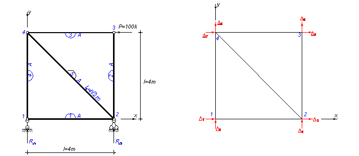 La grinda cu zabrele din figura se cere sa se determine deplasarile nodale, eforturile si tensiunile in bare. Rezultatele se vor verifica cu pro 212h79c gramul "TRUSS"