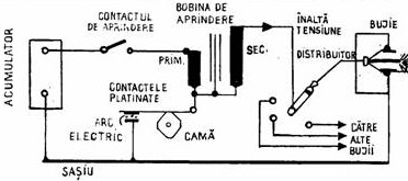 Contactul de aprindere fiind inchis, o cama antrenata de motor inchide si