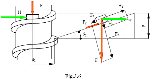 Strângerea piulitei unui surub sub actiunea unei forte axiale F poate fi echivalata cu deplasarea unui corp cu greutatea F pe un plan înclinat, al carui unghi fata de orizontala este egal cu unghiul β2 de înclinare a spirei filetului. Forta H necesara pentru împingerea corpului F pe planul înclinat corespunde fortei H care da nastere momentului necesar pentru deplasarea aceleiasi sarcini F (fig.3.6)