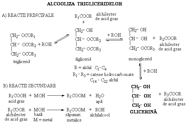 Biodieselul este un amestec de esteri metilici ai uleiurilor vegetale, care se obtine printr-o serie de reactii de tranesterificare. In general esterii acizilor grasi se pot obtine prin tehnologii de derivatizare chimica (esterificarea directa a acizilor grasi rezultati ca subproduse la fabricarea sapunurilor sau rafinarea uleiurilor vegetale brute) sau prin semisinteza (prin alcooliza trigliceridelor naturale prezente în uleiuri vegetale si grasimi animale). În cazul utilizarii tehnologiilor de semisinteza, esterii acizilor grasi se pot obtine printr-un proces necostisitor si eficient din gliceride cu continut mare de acizi grasi. Sinteza acestora implica reactia de trans-esterificare a trigliceridelor continute în surse de origine animala sau vegetala cu alcooli C1-C4, obtinându-se alchilesteri C1-C4 si glicerina bruta ca subprodus. Reactiile de alcooliza (metanoliza) a trigliceridelor pentru producerea de biodiesel sunt prezentate mai jos.