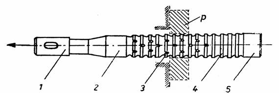 Brosa se compune din mai multe parti distincte (fig. 2.41): 1 – cap antrenor; 2 – ghidaj anterior; 3 dinti de degrosare; 4 dinti de finisare si 5 – ghidaj posterior. Din schita mai rezulta si modul de lucru a acestei scule, in care p este piesa fixata in dispozitivul d al masinii de brosat.