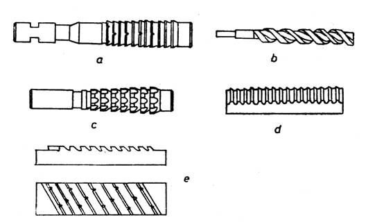 c. dupa felul profilului, brosele pot fi pentru gauri circulare (fig. 2.43, a, b), brose pentru caneluri (fig. 2.43, c), pentru profile poligonale, pentru canale de pana (fig. 2.43, d si pentru suprafete plane sau profilate deschise (fig. 2.43, e).