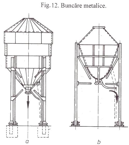 Buncarele (fig.12) sunt vase de forma prismatica, cilindrica sau conica in care se depoziteaza, pentru scurt timp, materiale varsate. Cand inaltimea vasului este de aeelasi ordin de marime cu dimensiunile lui transversale, 858c23i el poarta denumirea de buncar propriu-zis, iar cand inaltimea este mult mai mare in rapert cu dimensiunile sectiunii transversale, vasul poarta denumirea de siloz