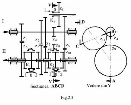 Aplicatie la o cutie de viteze, care de regula este un reductor care poate realiza mai multe rapoarte de transmitere, intr-un sens si in sensuri opuse. In Fig.2.3,se prezinta schema structurala a unei cutii de viteze de la Dacia 1300. Constructiv, cutia prezinta un arbore primar ( I ), care primeste miscarea de la motor si care prin intermediul mai multor perechi de roti dintate transmite miscarea la arborele secundar ( II ), realizand 4 rapoarte de mers inainte si unul de mers inapoi. Dela arborele secundar, miscarea se transmite la diferentialul transmisiei care distribuie miscarea la cele doua roti motoare. Pentru mersul inapoi intervine si o axa pe care este montata roata inversoare de sens.(Z11 ) Axa este un arbore care nu transmite momente de torsiune. Schimbarea rapoartelor se realizeaza cu ajutorul unui mecanism care comanda cele trei cuplaje, din pozitiile pasive 0, in pozitiile active, 1 sau 2. Cutia de viteze, din Fig.2.3, desenata cu toate cuplajele pe pozitia de zero,nu transmite miscare. In Tabelul 2.1, sunt date numarul de dinti ai rotilor Tabelul 2.1
