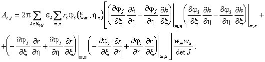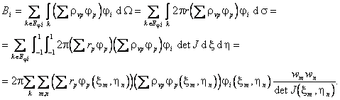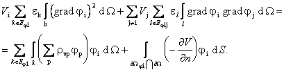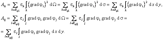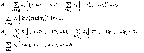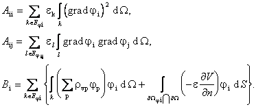 unde p sunt indicii functiilor de aproximare care contin in suportul lor regiunea cu densitate de sarcina adevarata. Se obtine astfel forma ecuatiilor (3.9), in care integralele pe intregul domeniu W sunt inlocuite cu sume de integrale pe elemente, si anume pe toate elementele care contin nodul asociat functiei ji (cu indici in multimea Eji