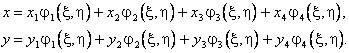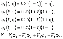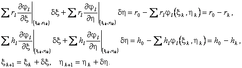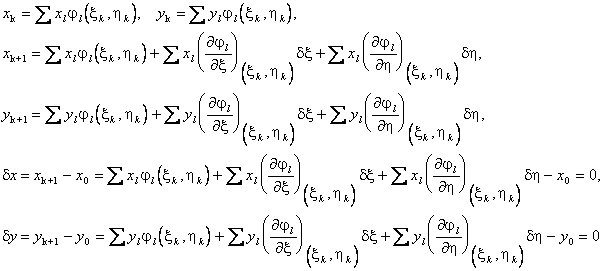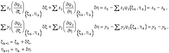 unde x si h reprezinta coordonatele in spatiul de referinta ale punctului (x0, y0) din spatiul real. Pentru determinarea acestor coordonate trebuie inversata transformarea (3.34). Daca pentru elementele cu dependenta liniara aceasta inversare se poate face chiar analitic, pentru cele de ordin superior aceste coordonate se determina prin calcul iterativ. Se utilizeaza de obicei un algoritm de tip Newton-Raphson, care pentru un element plan izoparametric oarecare si pentru functiile diferenta intre coordonatele aproximantului la pasul k si coordonatele punctului (x0,y0) se scrie astfel