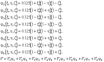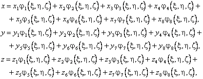 Elementele tridimensionale in spatiul de referinta pot fi de tip cub cu opt sau mai multe noduri, prisma cu sase sau mai multe noduri si tetraedru cu patru sau mai multe noduri. Elementul de tip hexaedru cu opt noduri este descris de urmatoarele functii de aproximare