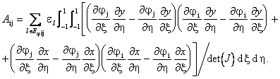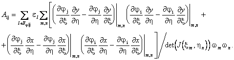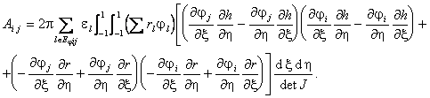 Calculul integralei de mai sus pentru elementele izoparametrice cu muchii drepte s-ar putea efectua in forma analitica, determinand primitiva, avand la dispozitie forma analitica a elementelor matricii de transformare din (3.40). Pentru o tratare unitara a tuturor elementelor izoparametrice se prefera insa folosirea cvadraturii numerice (cu formule de cuadratura de tip Gauss). Calculul integralelor duble se reduce la o suma dubla