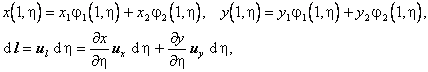 Pentru termenii asociati densitatii superficiale de sarcina rS trebuie avut in vedere faptul ca pentru campul plan-paralel suprafata laterala a elementelor este suprafata laterala a unor prisme drepte, iar in sectiunea plana ea corespunde laturii patrulaterului. Integrala de suprafata va trece intr-o integrala de linie. Deplasarea pe latura in spatiul real corespunde deplasarii pe latura corespunzatoare din spatiul de referinta, pe care variaza numai una dintre variabilele x sau h. Daca presupunem ca latura este chiar latura 1, deci in spatiul de referinta coordonata x ia valoarea 1 iar coordonata h ia valori in [-1,1], atunci putem descrie pozitia unui punct curent pe latura l1 precum si un segment infinitezimal orientat de-a lungul aceleiasi laturi
