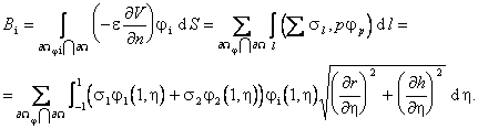 Pentru termenii asociati densitatii superficiale de sarcina trebuie avut in vedere faptul ca suprafata laterala a elementelor axial simetrice este suprafata laterala a unui trunchi de con, iar in sectiunea radiala ea corespunde laturii patrulaterului. Integrala de suprafata va trece intr-o integrala de linie. Deplasarea pe latura in spatiul real corespunde deplasarii pe latura corespunzatoare din spatiul de referinta, si deci variatiei uneia singure din variabilele x sau h. Daca presupunem ca latura este chiar latura 1, deci in spatiul de referinta coordonata x ia valoarea 1 iar coordonata h ia valori in [-1,1], atunci putem descrie pozitia unui punct curent pe latura l1 precum si un segment infinitezimal orientat de-a lungul aceleiasi laturi