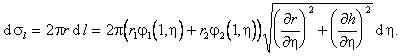 Integralele de mai sus, care la origine erau integrale de volum, au devenit integrale de suprafata calculate pe sectiunea radiala. Folosind transformarea intre spatiul de referinta si cel real, deci intre planul (x h) si planul (r, h), aria elementului infinitezimal de suprafata devine