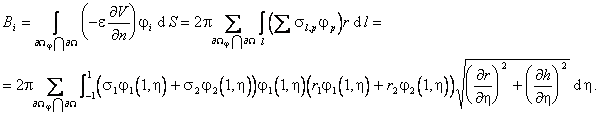 In termenul Bi integrala de volum asociata densitatii volumice de sarcina adevarata, poate fi trecuta la limita intr-o integrala de suprafata in cazul distributiilor de suprafata a sarcinii adevarate, sau chiar intr-o integrala curbilinie la distributiile lineice. De obicei aceste distributii sunt chiar pe fetele elementelor sau se urmareste alegerea elementelor astfel incat sarcinile sa se gaseasca pe fetele sau pe muchiile lor. In cazul sarcinilor punctuale, pentru care in fond distributia de sarcina volumica este de tip Dirac, integrala de volum din (3.15) se reduce la o distribuire la nodurile elementului in interiorul caruia se afla punctul cu sarcina electrica adevarata a valorii acesteia. Regula de distributie este dictata de valorile functiilor de aproximare in pozitia corespunzatoare punctului cu sarcina concentrata. Cum suma functiilor de aproximare este egala cu 1 in orice punct din domeniul W, conditie ce este asociata cerintei de reprezentare a unui camp de potential uniform, rezulta ca suma fractiilor asociate nodurilor frontierei domeniului W va fi egala cu valoarea sarcinii punctuale.