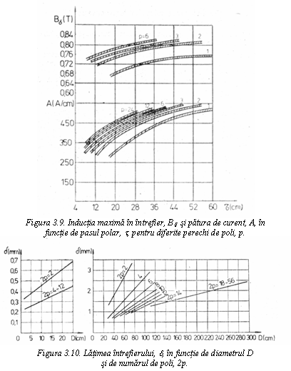 Valoarea maxima a inductiei in intrefier, Bd, se estimeaza in functie de numarul perechilor de poli, p si de pasul polar, t, din figura 3.9. Odata determinate elementele constructive ale masinii, care determina valoarea inductiei in intrefier, se calculeaza Bd si se verifica daca diferentele dintre cele doua valori (estimata si calculata) se inscriu in limitele recomandate.