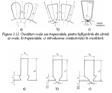 Daca infasurarea este confectionata din sarma (conductor rotund), crestaturile au forma ovala sau trapezoidala si sunt semideschise sau semiinchise (figura 3.12). Acestor tipuri de crestaturi le corespund, in mod firesc, dinti cu pereti paraleli.