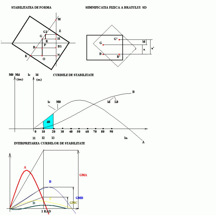 Curba A este CSS a navei si da variatia momentului sau bratului de ss in functie de variatia unghiului de inclinare transversala.Atata timp cat are stabilitate nava opune oricarui moment de inclinare un moment de redresare egal ca marime dar cu actiune opusa.Fortele componente ale cuplului de redresare D si F au actiune verticala astfel ca lucrul mecanic efectuat de acesta va depinde numai de variatia pe verticala a pozitiei punctelor de aplicatie ale acestor forte G si B Lo= D(a' - a)