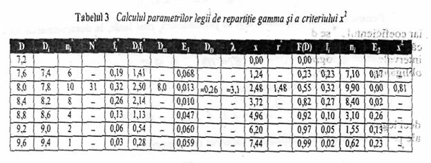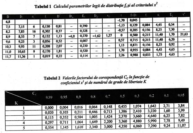 iar coeficientul x2 se determina in mod analog. Folosind acelasi tabel 2 si cunoscand ea in cazul legii gamma din numarul de grade de libertate egal cu numarul de intervale ale histogramei (sase) trebuie sa se scada acelasi numar de legaturi obligatorii (trei), rezulta ca factorul de corespondenta are valoarea :