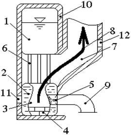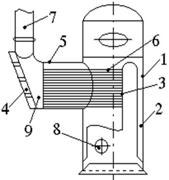 Colectorul superior 1 este legat de colectorul inferior prin tuburile de apă 6; focarul 3 este amplasat în interiorul colectorului inferior 2, fiind prevăzut cu vatra de cărămidă refractară 4, având legatura printr-un racord cu camera de fum 7, permitând astfel gazelor de ardere să treacă prin tubulatura 8 (esapamentul) spre cosul navei. Combustibilul este introd în focar prin tubul 9 si arzătorul 5 (de una sau doua duze).