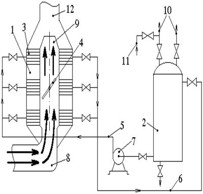 Aparatele de măsură si control la caldarina recuperatoare sunt aceleasi ca si la caldarina cu arzător. Circulatia fortată a apei este realizata cu o pompă de presiune (recirculatie) 7 prevăzuta cu o valvula de trecere by-pass pentru reglarea debitului pompei. Reglarea debitului de abur se realizeaza prin reglarea cantitatii de gaze care trece printre serpentine cu ajutorul valvulei 4 prin introducerea treptată în circulatie a 2 sau mai multe serpentine de vaporizare sau prin reglarea debitului pompei de circulatie 7 care măreste sau micsorează viteza de circulatie a apei prin serpentine.