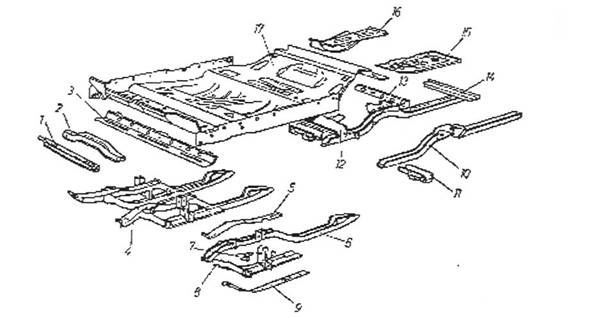 Fig.6.3. Elementele sudabile ale planseului unui autoturism cu caroseria autoportanta: