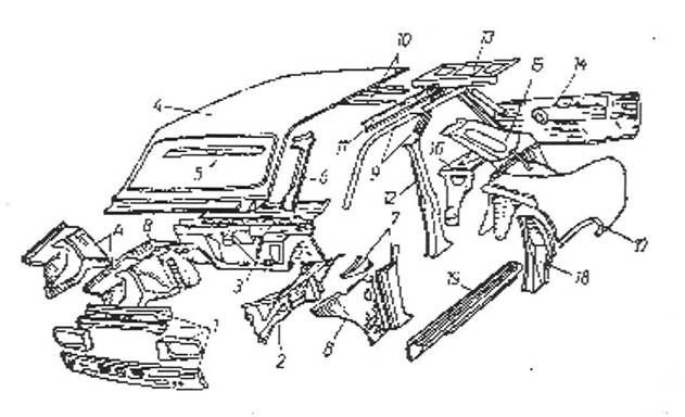 Fig. 6.4. Elementele sudabile ale suprastructurii unui autoturism cu croseria autoportanta: