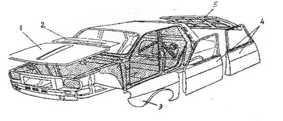 Caroseria asamblata impreuna cu elementele detasbile este prezentata in fig. 6.5. Elementele detasabile sunt: capota motorului 1, gila exterioara 2, aripa din fata 3, usile din fata si spate 4, capota portbagajului 5. Se observa ca o caroserie autoportanta este constituita dintr-un mare numar de elemente componente, asamblate cu ajutorul sudurii prin puncte. Numarul elementelor componente este determinat de necesitati tehnologice, fiecare piesa in oarte fiind obtinuta prin presare si ambutisare la rece din tabla de otel de grosimi cuprinse intre 0,72 mm.