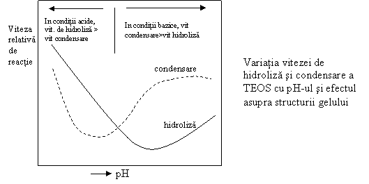 Astfel, în mediu acid, hidroliza tetraetoxisilicatului (TEOS) este mai rapida decât condensarea iar gelul rezultat este slab reticulat. În mediu bazic, raportul vitezelor este invers iar gelul rezultat este puternic reticulat. Este evident ca solidele rezultate vor avea o structura de pori si o functionalitate a suprafetei, diferite.