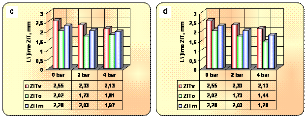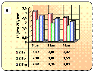 Fig. 4.13. Influenta presiunii asupra latimii zonei influentate termic: c- cordonul 3; d- cordonul 4; e- cordonul 5; ZITv- latimea ZIT în plan vertical; ZITo- latimea ZIT în plan orizontal;