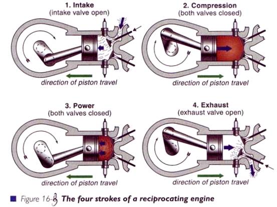 Cand pistonul se apropie din nou de capul cilindrului in timp ce ultimela gaze arse sant evacuate, supapa de admisie se deschide si cea de evacuare se inchide initiindu-se astfel din nou primul timp-admisia, si ciclul se reia.