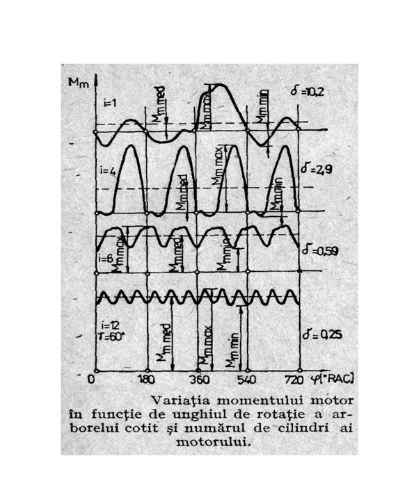 DIAGRAMA DE VARIATIE A MOMENTULUI MOTOR PENTRU UN CICLU MOTOR (7200 RAC) PENTRU MOTOARE CU I=1,4,6 SI 12 CILINDRI ( δ ESTE DISPERSIA MOMENTULUI PE CICLU,