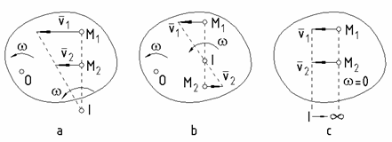 3. Din campul de viteze, se cunosc vitezele a doua puncte ale placii M1 si M2, perpendiculare pe dreapta M1M2. Centrul instantaneu de rotatie se afla la intersectia dreptelor care trec prin originea si extremitatea vectorilor viteza ale celor doua puncte (fig.18.a si fig.18.b). Daca vitezele celor doua puncte sunt egale, centrul instantaneu de rotatie este la infinit, viteza unghiulara a placii este nula, placa executand o miscare de translatie (fig.18.c).