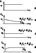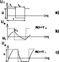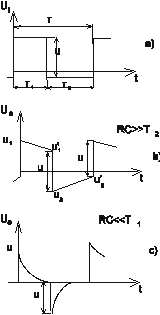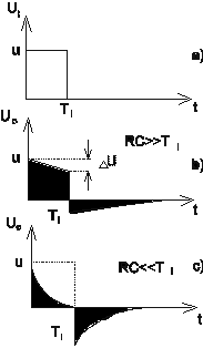 Aplicând la intrare un semnal rectangular (format din impulsuri periodice), de amplitudine U _i cu perioada de repeti_ie T ce poate fi mai mic_ decât durata regimului tranzitoriu al circuitului (figura 1.3a), r_spunsul circuitului este ilustrat de figura 1.3b _i figura 1.3c, dup_ cum este rela_ia între constanta de timp a circuitului _i perioada de repeti_ie a semnalului.
