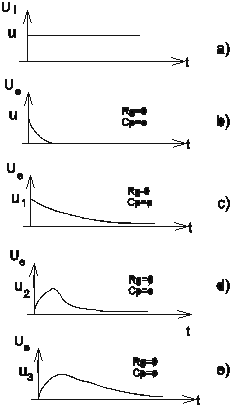 Aplicând la intrare un semnal impuls de durat_ Ti _i perioad_ de repeti_ie T, mai mare decât durata regimului tranzitoriu (figura 1.2a), r_spunsul circuitului va fi dat de figura 1.2b _i figura 1.2c, dup_ cum constanta de timp a circuitului ( =RC) se g_se_te fa__ de durata Ti a impulsului, primul caz corespunzând rela_iei >>Ti, respectiv al doilea, rela_iei <<Ti.